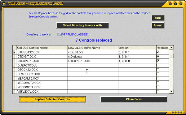 Click on the replace button and OLE Fixer will replace the old version of the control with the new one for all the Classes and Forms in the directory.